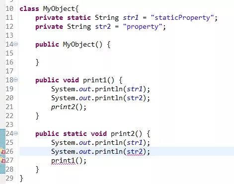 此时对象都没有,str2 根本就不存在,所以就会产生矛盾了。同样对于方法也是一样,由于你无法预知在 print1 方法中是否访问了非静态成员变量,所以也禁止在静态成员方法中访问非静态成员方法。