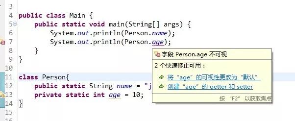 提示错误 "Person.age 不可视",这说明 static 关键字并不会改变变量和方法的访问权限。